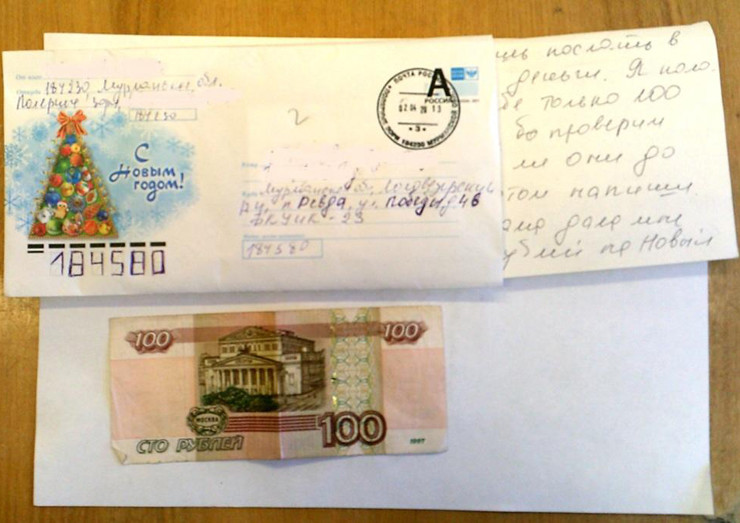 Деньги были положены в почтовый конверт, который отправила жительница Полярных Зорь. В письме лежала купюра номиналом в 100 рублей.