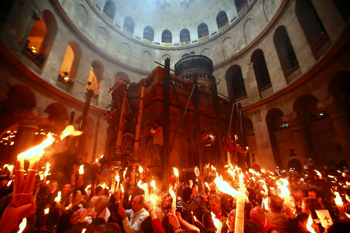 Сегодня в Иерусалиме в Кувуклии храма Гроба Господня традиционно сошел Благодатный огонь.