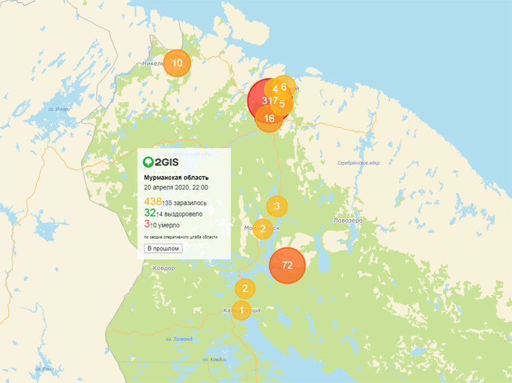 Сервис онлайн-карт 2ГИС запустил в приложении карту заболеваемости коронавирусной инфекцией в Мурманской области.