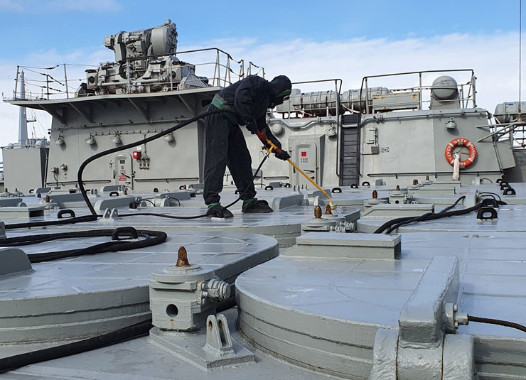 На крейсере были отработаны дезинфекция палуб, надстроек, оружия и технических средств корабля с помощью дезинфицирующего раствора и пара. Личный состав «Петра Великого» отработал нормативы надевания защитных средств и приведения систем специальной обработки в боевую готовность.