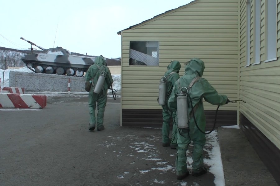 Десять военнослужащих роты РХБЗ оснащенные средствами индивидуальной защиты ежедневно проводят дезинфекцию объектов войсковой части 1% раствором ДТС ГК (дветретиосновная соль гипохлорита кальция). Обработке подергаются КПП, столовые парковые зоны, а также транспортные средства, которые возвращаются с рейса.