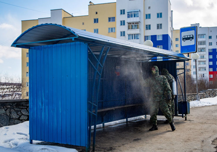 В Североморске на остановках общественного транспорта провели дезинфекцию. Специалисты радиационной, химической и биологической защиты Северного флота обработали поверхности раствором двутретиосновной соли гипохлорита кальция.