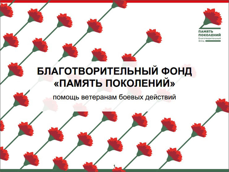 Фонд «ПАМЯТЬ ПОКОЛЕНИЙ» — единственная в России некоммерческая организация, формирующая новую благотворительную традицию по оказанию адресной высокотехнологичной медицинской помощи ветеранам всех боевых действий, в которых принимала участие наша страна. Основан 22 июня 2015 года. За время работы помощь оказана более чем 12 000 ветеранов, проживающих в различных городах России от Калининграда до Владивостока, на общую сумму порядка 1,285 млрд рублей.
