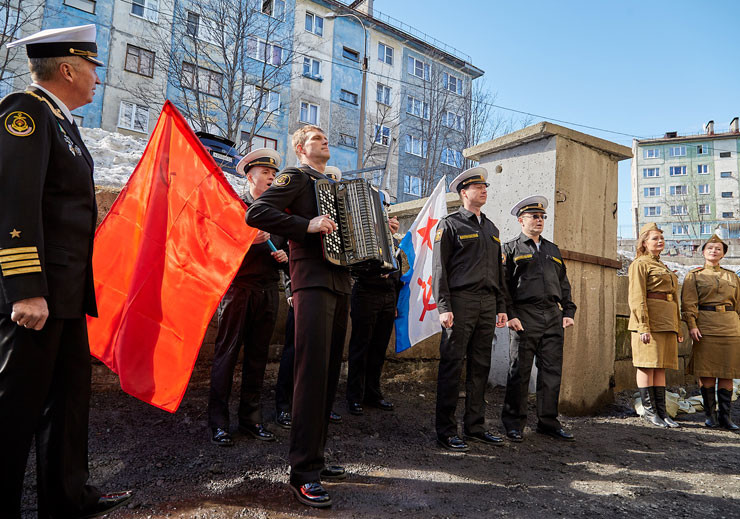 В Мурманске концертная бригада ансамбля песни и пляски Краснознамённого ордена Ушакова Северного флота поздравила ветеранов Великой Отечественной войны, выступив для них во дворе.