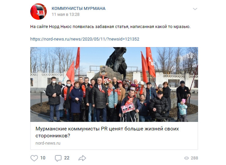 Причиной обращения стала публикация в группе «Коммунисты Мурмана», где указана ссылка на новость информагентства с подписью «На сайте Норд Ньюс появилась забавная статья, написанная какой то мразью».