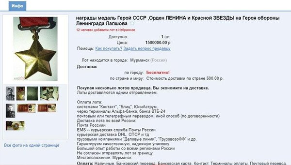 Продавец предлагал приобрести медаль «Золотая Звезда» и орден Ленина. Уточняется, что Иван Лапшов участвовал в обороне Ленинграда, Эстонии и острова Ханко.