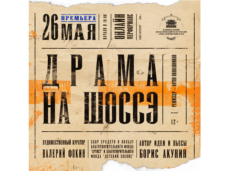 В вторник, 26 мая, при поддержке Сбербанка состоится благотворительный показ премьеры онлайн-перформанса «Драма на шоссэ. Судебное разбирательство», идея и пьеса – Борис Акунин. Показ открывает новый мультижанровый виртуальный проект Александринского театра «Другая сцена». «Драма на шоссэ» для Александринского театра и Бориса Акунина стала первым опытом интерактивного спектакля в онлайн-формате. Спектакль будет эксклюзивно транслироваться ВКонтакте, в официальной группе театра.
