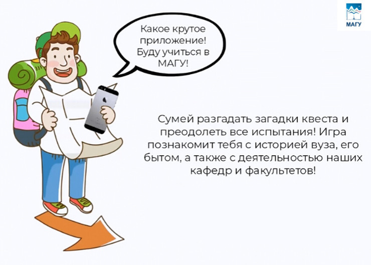 «Знакомство с МАГУ» - это интерактивный квест с игровыми персонажами и ежедневными заданиями. Пользователям будет предложено несколько видов заданий на внимательность, эрудицию, знания топографии, ботаники и истории. Например, найти qr-код, сигнальное изображение или bluetooth-маячок, пройти мини-игру (в реальном мире и в смартфоне), ввести код в поле ввода, ответить на вопросы теста. Если у игрока возникнут трудности при прохождении квеста, ему поможет игровой персонаж.