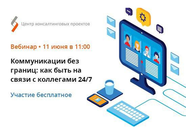 Центр консалтинговых проектов приглашает на бесплатный вебинар «Коммуникации без границ: как быть на связи с коллегами 24/7», который состоится 11 июня в 11:00.