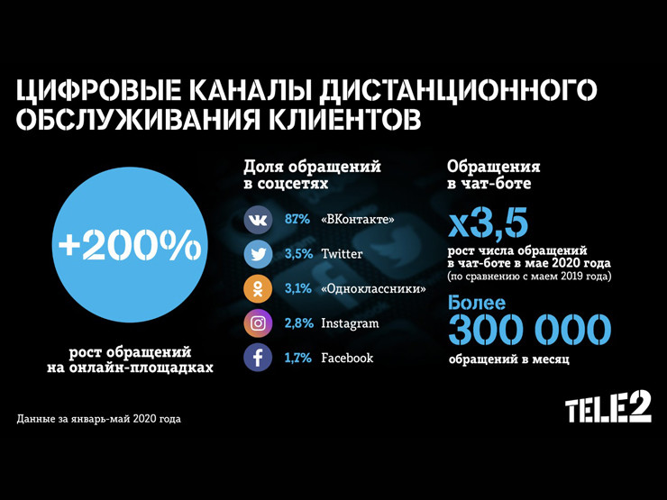 Все более востребованным у клиентов становится чат-бот Tele2, который функционирует на основе искусственного интеллекта и обучается по мере обработки запросов. Он был запущен в октябре 2018 года и стремительно набирал популярность. В январе-мае 2020 года число обращений, закрытых чат-ботом, выросло в 3,5 раза год к году. Он обрабатывает до 15 000 обращений в сутки и более 300 000 запросов в месяц.