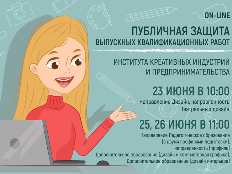 А будущие педагоги с профилями Дополнительное образование (дизайн и компьютерная графика) и Дополнительное образование (дизайн интерьера) будут защищать свои работы перед членами государственной экзаменационной комиссии 25 и 26 июня в 11:00. К защите представлено 18 работ, которые освещают педагогический аспект разработки интерьеров общественных пространств и учебных лабораторий, иллюстрирование печатных и периодических изданий, а также проект платформы интерактивного взаимодействия с населением и систематизации культурных инициатив.