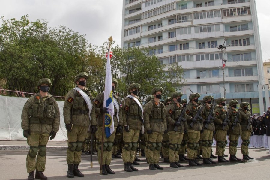 Военнослужащие Северного флота были одеты демисезонную форму из-за дождя и низкой температуры воздуха. Для предотвращения распространения коронавирусной инфекции все военные носили маски и перчатки.