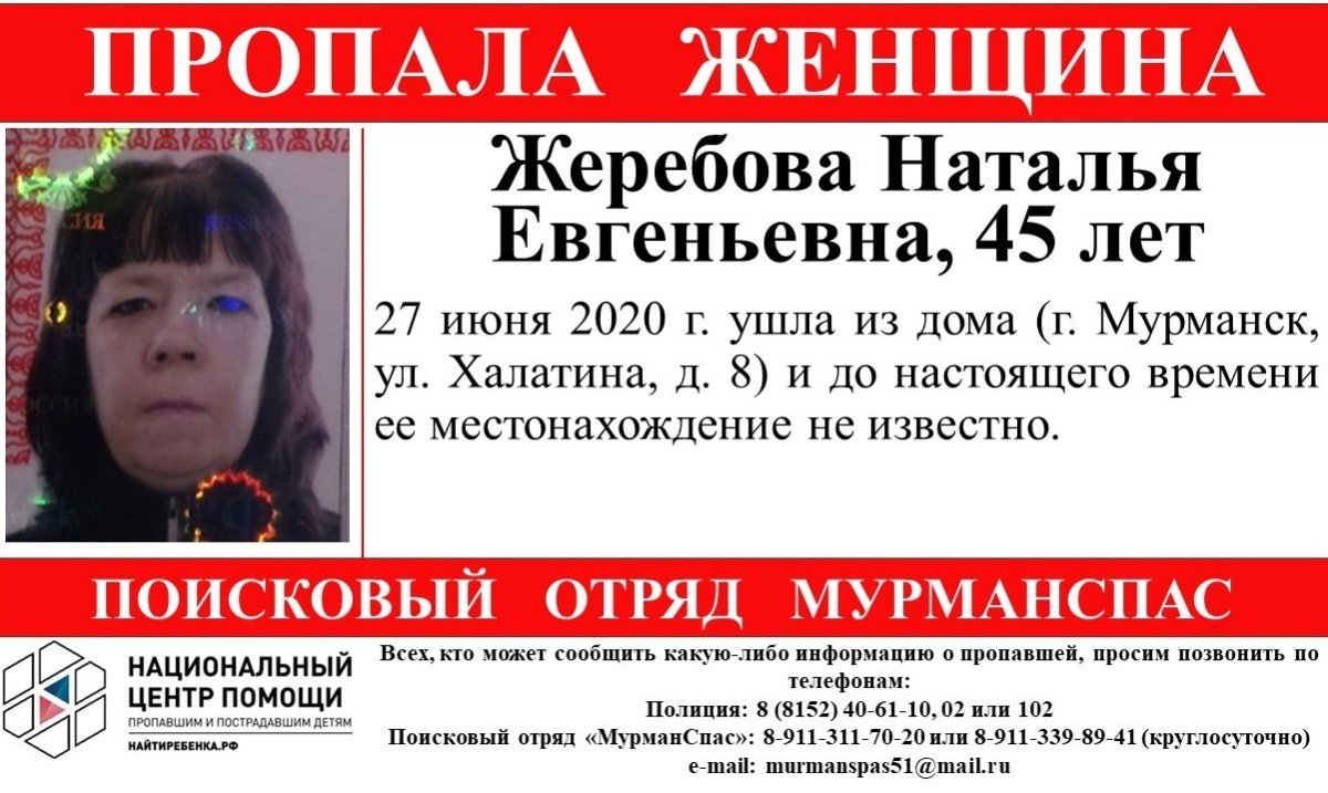 Тех, кто имеет информацию о местонахождении Натальи Жеребовой, просят сообщить в полицию по номерам: 102, 02 или 8 (8152) 40-61-10. Также информацию о пропавшей можно сообщить в «МурманСпас» по телефонам: 8-911-339-89-41 или 8-911-311-70-20.