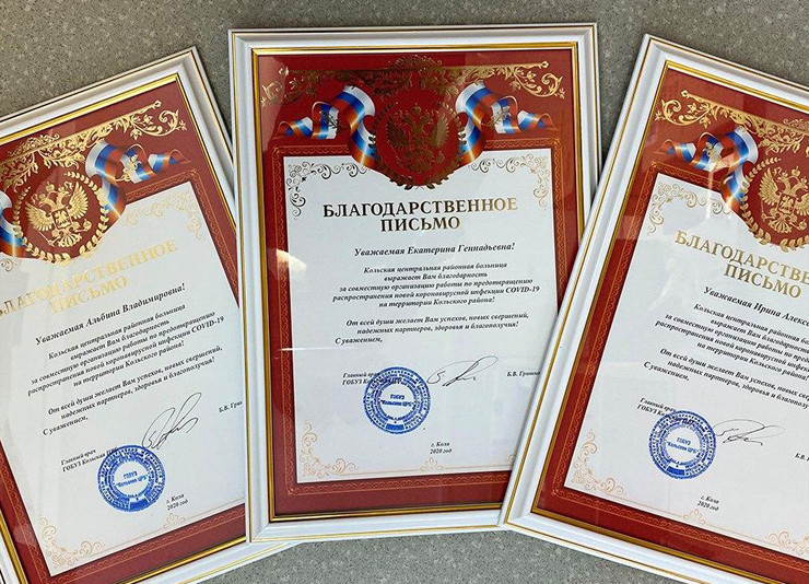 Благодарности были вручены Екатерине Волгиной, Альбине Усмановой и Ирине Лебедевой. Главврач Кольской ЦРБ отметил вклад медработников в ликвидацию вспышки коронавируса на территории строительства объекта в Белокаменке и ещё раз поздравил награждённых с профессиональным праздником - Днём медицинского работника.