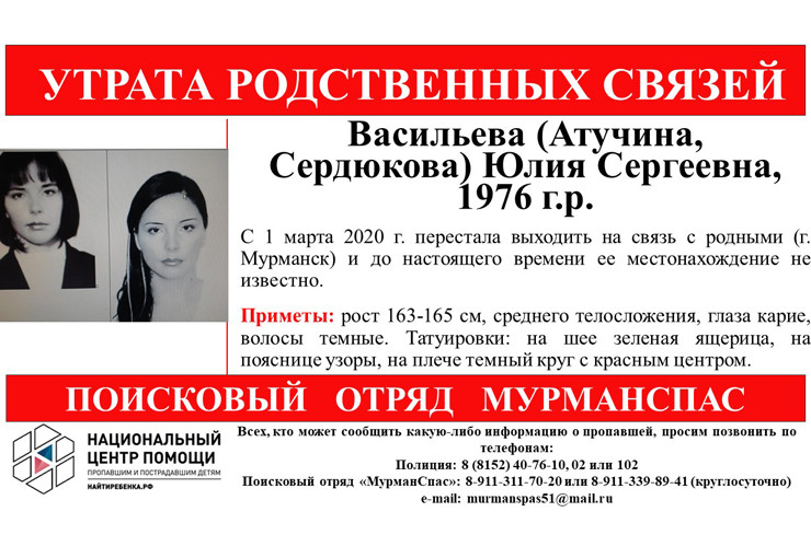 В Мурманске поисковый отряд «МурманСпас» разыскивает Юлию Васильеву (Атучину, Сердюкову). Женщина 1976 года рождения перестала выходить на связь с родственниками 1 марта 2020 года. С того момента о ее местонахождении ничего не известно. Отмечается, что она может находиться в другом регионе.