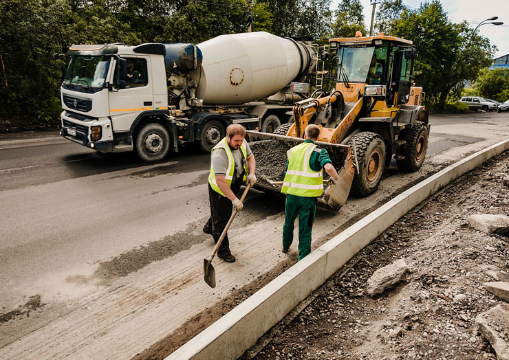В настоящее время рабочие заняты установкой бордюрного камня и подготовкой к укладке тротуара.