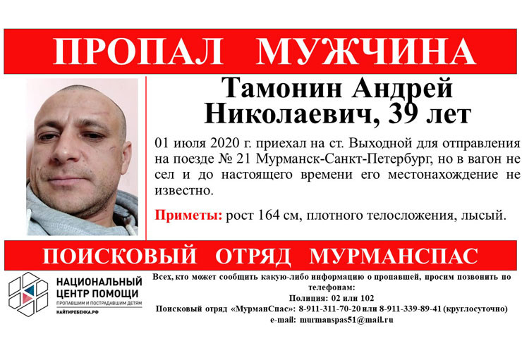 В Мурманской области разыскивают Андрея Тамонина. Как сообщает поисковый отряд «МурманСпас», 39-летний мужчина приехал на станцию Выходной, чтобы сесть на поезд до Санкт-Петербурга. В вагон мужчина не сел и о его местонахождении ничего неизвестно.