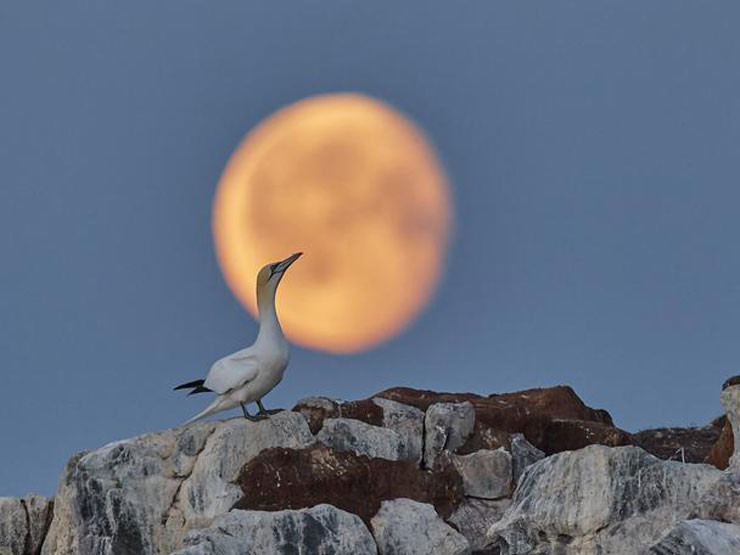 На фотографии изображена северная олуша на фоне красной луны. Птица внесена в Красную книгу Мурманской области. На Восточном Мурмане она гнездится с 1996 года. Численность возрастала до 2009 года, достигнув 335 пар. Затем наметилась тенденция к снижению и сейчас считается, что вид северная олуша – редкий, находящийся в состоянии, близком к угрожающему. Вид размножается на территории Кандалакшского заповедника.