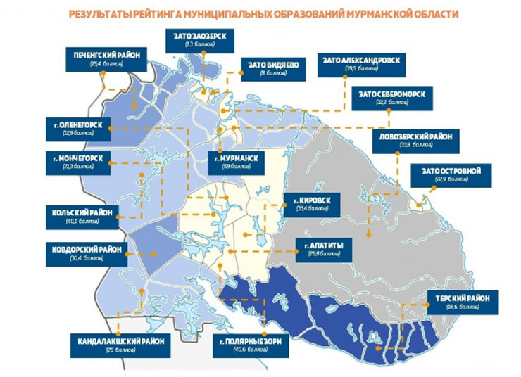 В ТОП-3 рейтинга попали Мурманск, Полярные Зори и Кольский район. На последних местах в списке оказались Оленегорск, ЗАТО Видяево, ЗАТО Заозерск.