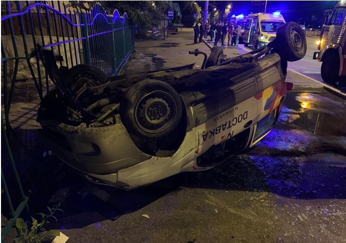 Минувшей ночью на улице Шмидта в районе перекрёстка с улице Комсомольской произошло ДТП. Водитель автомобиля доставки Daewoo не справился с управлением и допустил его опрокидывание с последующим столкновением с металлическим забором.