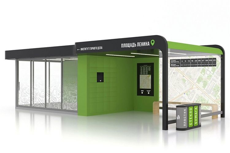 Согласно технического задания заказчика, это будет полуоткрытый сдвоенный остановочный павильон из стального каркаса. Планируются две теплые скамейки в павильоне, 2 USB зарядки. Комплекс будет оснащен светодиодным освещением, на все поверхности стекла наклеят антивандальную защитную пленку.