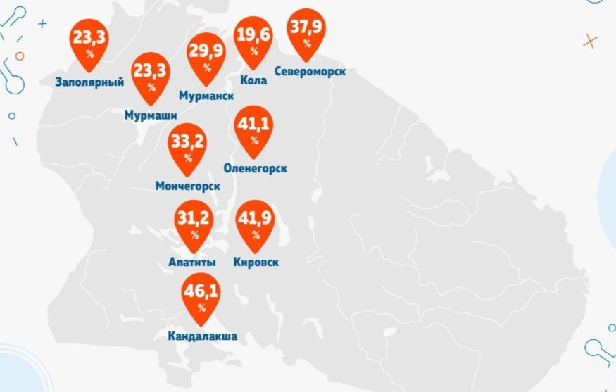 В Мурманске сформированность иммунитета к коронавирусу составляет 29,9%, в Заполярном – 23,3%, в Мурмашах – 29,9%, в Мончегорске – 33,2%, в Североморске – 37,9%, в Апатитах – 31,2%. Наименьший показатель зафиксирован в Коле – 19,6%.