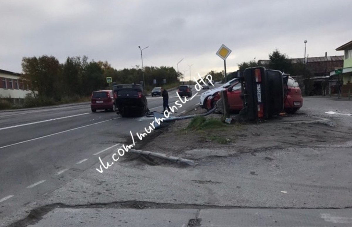 В четверг на автоподъезде к Североморску произошло столкновение автомобилей. Как сообщили в Госавтоинспекции, водитель Renault уснул за рулем и врезался в припаркованные автомобили. Затем Renault влетел в дорожный знак и перевернулся.