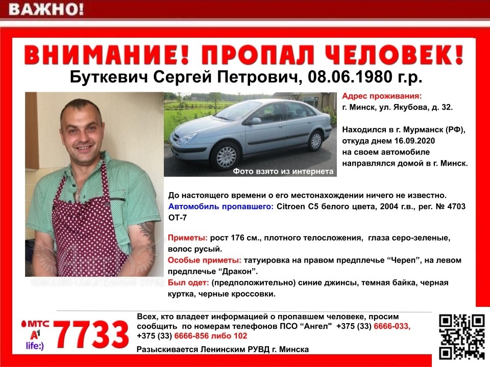 Всех, кто владеет информацией о местонахождении Сергея Буткевича, просят позвонить в поисковый отряд «МурманСпас» по телефонам: 8-911-311-70-20, 8-911-339-89-41, в поисковый отряд «Ангел»: +375-33-6666-003, +375-33-6666-856 или в полицию.