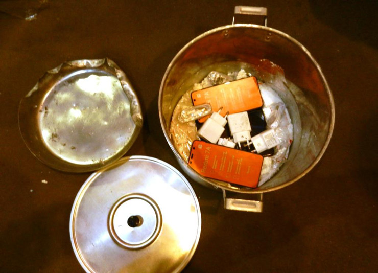 Сотрудники отдела безопасности мурмашинской ИК-18 строгого режима досматривают посылки. В одном из отправлений они обнаружили средства мобильной связи в двойном дне алюминиевой кастрюли.