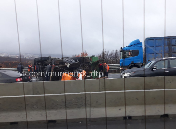 В пятницу утром на Восточно-Объездной дороге в Мурманске, недалеко от отворотки на улицу Шевченко, произошло ДТП. Грузовой автомобиль с прицепом лег на правый бок и перекрыл две полосы движения.