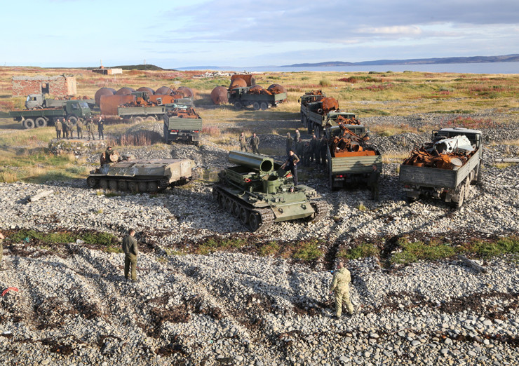 Далее металлический мусор грузили на КамАЗы, которые затем в губу Грязную Кольского залива вывозил экипаж большого десантного корабля «Александр Отраковский». Корабль совершил восемь рейсов, с последним он забрал острова и личный состав экологического взвода. Ранее очистка острова и вывоз мусора на острове проводилась, но не в таких больших масштабах. Основные работы по ликвидации экологического ущерба в Арктике североморцы проводили на острове Котельный в море Лаптевых, откуда за пять лет было вывезено более 3,5 тысяч тонн металлолома, в основном бочек из-под топлива и ГСМ, оставленных там чуть ли не с советского времени.