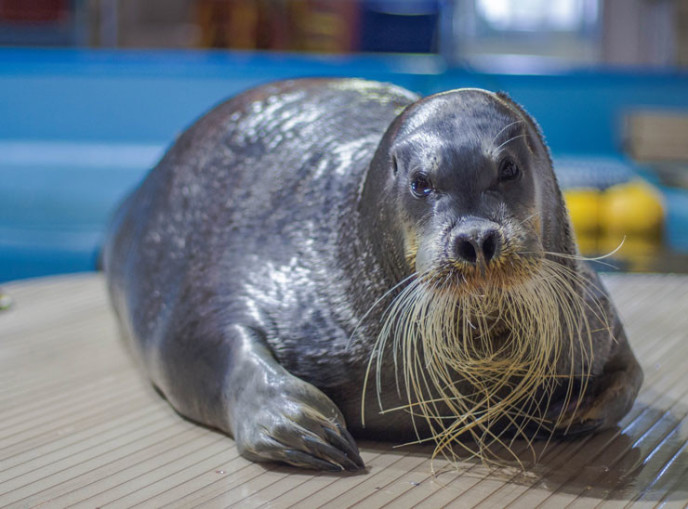 В честь дня рождения океанариум показал тренировку одного из главных артистов – морского зайца Дика. Усатый лахтак выполнил на камеру сложные элементы представления.
