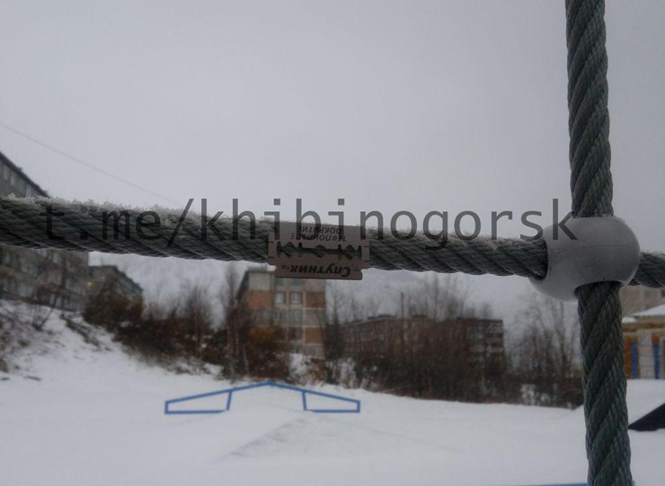 В одном из городов Мурманской области на детской площадке обнаружили опасные предметы. Лезвия от бритв приклеены к поручням и канатам так, чтобы люди, взявшись за них, поранили себе руки. Фотографии опубликовал один из телеграм-каналов Апатитско-Кировского района.