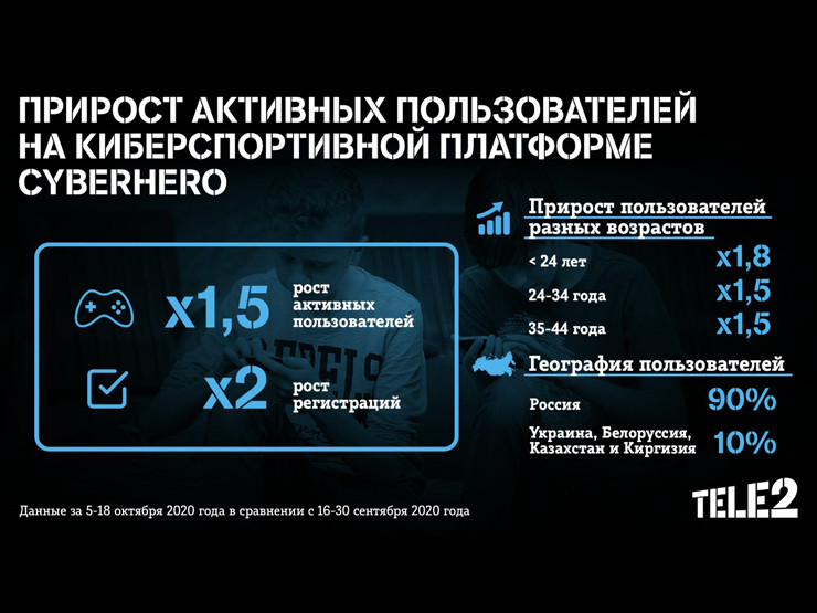Tele2 отметила прирост активных пользователей на киберспортивной платформе Cyberhero в 1,5 раза во время внеплановых школьных каникул 5-18 октября. При этом компания зафиксировала прирост не только юной аудитории, но и игроков в категории 35-44 года.