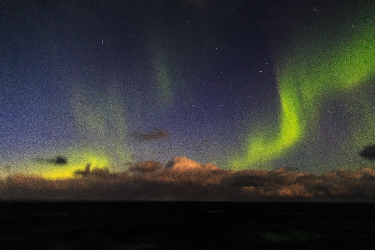 Мощное полярное сияние запечатлели с борта барка «Седов» в Норвежском море. На борту парусника курсанты следуют из Мурманска в Калининград.