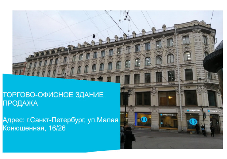 На аукцион выставлены торгово-офисные помещения, в том числе офисы с видом на Казанский собор, общей площадью 5 224,1 кв. м., расположенные по адресу: Санкт-Петербург, Малая Конюшенная ул., 16/26. Из них: подвал – 118 кв. м., цокольный этаж – 61,3 кв. м., 1 этаж – 166,9 кв. м., 2 этаж – 818,2 кв. м., 3 этаж – 929,5 кв. м., 4 этаж – 930,5 кв. м., 5 этаж – 877,2 кв. м., мансарда – 289 кв. м., чердак – 336 кв. м., лестницы – 614,6 кв. м.