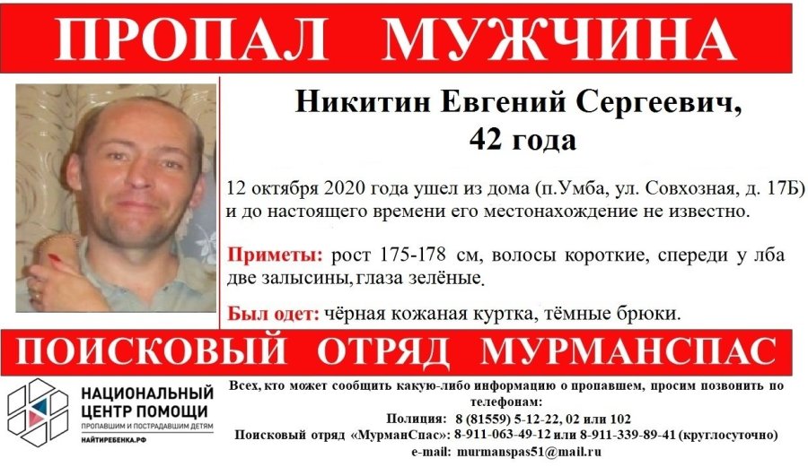 Полиция и поисковые отряды уже почти месяц разыскивают в Мурманской области Евгения Никитина. Мужчина вышел из дома на улице Совхозная в Умбе 12 октября и пропал. До настоящего времени о нем нет никакой информации.