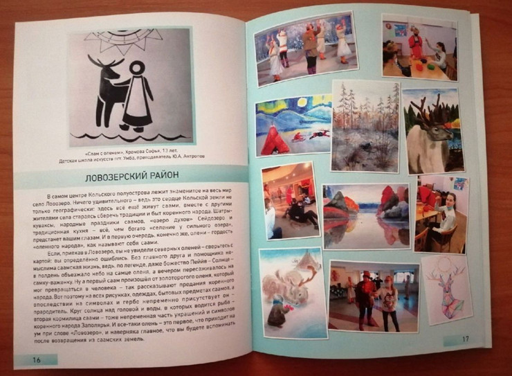 В перерывах между поездками дети рисовали свои впечатления и символы районов Кольского полуострова. Сама карта разделена на 11 маршрутов и наполнена картинами-символами детей, где каждому маршруту посвящён целый разворот. На первой странице крупным планом символ района с описанием, на второй – коллаж работ-впечатлений и фотографии с поездок.