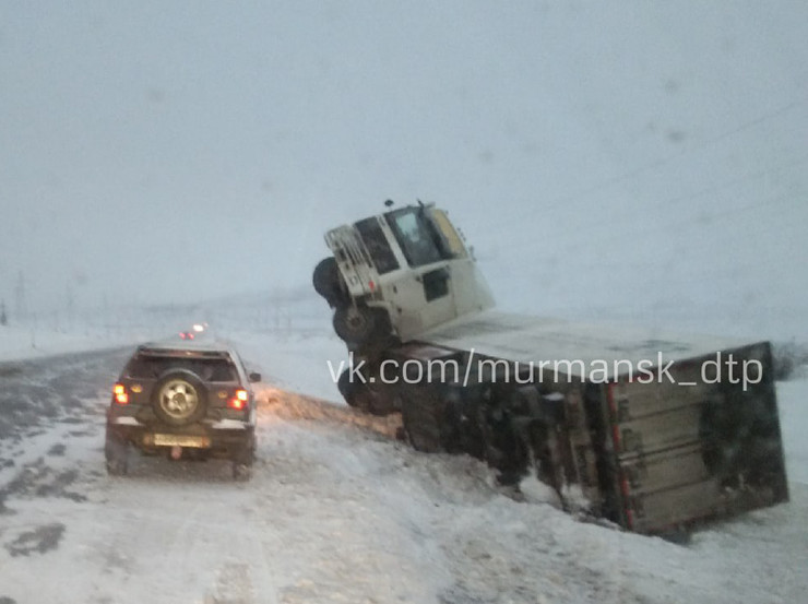 В Мурманской области недалеко от Мончегорска произошло ДТП с грузовым автомобилем. Фура вылетела в кювет и упала на правый бок.