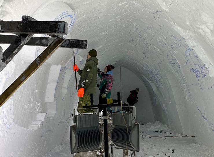 В Кировске началось оформление будущих залов «Снежной Деревни». Для этого приглашены художники. На снежных стенах уже можно увидеть эскизы рисунков.