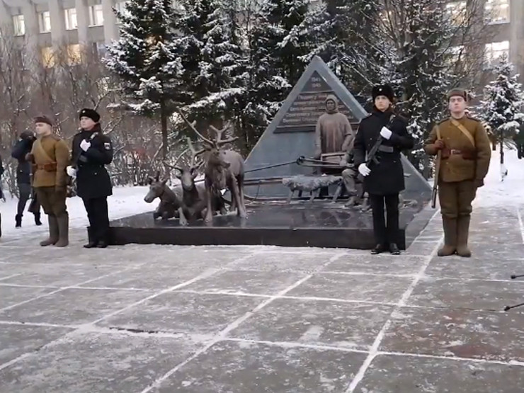 В Мурманске состоялась церемония открытия памятника «Подвигу бойцов оленетранспортных батальонов - защитников Советского Заполярья в годы Великой Отечественной войны 1941-1945 годов». Мемориальный объект установлен у дома №129/1 на Кольском проспекте, возле здания администрации Первомайского округа.