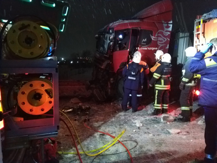 Как сообщает Северо-Западный РПСО, пострадал один из водителей грузовика SCANIA. Спасатели деблокировали мужчину и передали работникам скорой медицинской помощи.