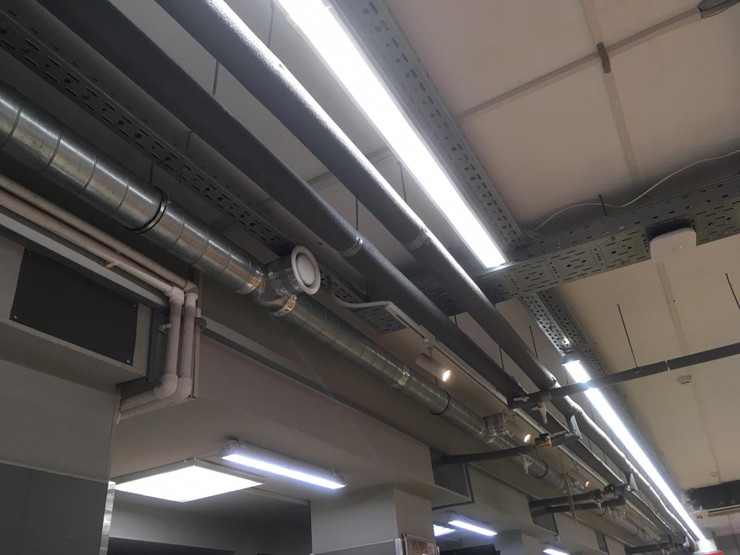 Подрядчик также провел ремонт в продолжающем работу супермаркете. По словам директора ООО «Сантехмонтаж» Сергея Шведова, новые инженерные сети пришлось тянуть под потолком из-за того, что старые оказались замурованы в полу цокольного этажа. Подрядчик справился с работой, несмотря на все трудности.