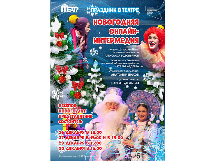 Мурманский областной драматический театр проведет новогоднюю онлайн-интермедию. Спектакли покажут дистанционно в период с 26 по 30 декабря.
