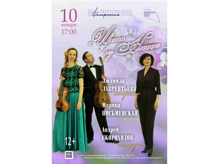 В воскресенье, 10 января, в Мурманской областной филармонии состоится концертная программа «Цветы из Ниццы». В исполнении Людмилы Лаврентьевой, Марины Письменской (альт) и Андрея Скороходова (гитара) прозвучат популярные мелодии и песни «В крови горит огонь желанья» (М. Глинка, А. Пушкин), «Серенада» Ф. Шуберта, «Гитары и мандолины» К. Сен-Санса, «Цветы из Ниццы» Денеша Будей и другие.