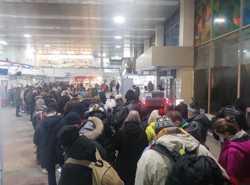 О большой очереди на досмотр накануне сообщили пользователи социальных сетей. Людей скопилось столько, что они заняли почти всю зону регистрации. Понятно, что ни о какой социальной дистанции в период пандемии коронавируса речи не шло.