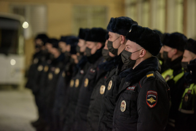 Строевой смотр личного состава состоялся перед отправлением на территории УМВД по Мурманской области. Командир отряда долодил начальнику управления Виталию Зайкову о готовности.