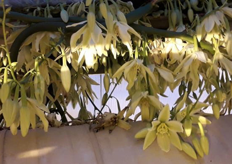 На цветоносе некрупные цветки диаметром не более 5 см собраны в метелочки. Их количество может достигать одной тысячи. Цветки источают сильный аромат. После цветения растение полностью погибнет, оставляя после себя множество укоренившихся деток, а в природе – еще и семян.