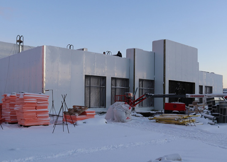 На сегодняшний день полностью завершен монтаж металлоконструкций будущего здания. Заканчивается монтаж сэндвич-панелей, выполняется стяжка полов административного и основного корпусов, монтируется кровля. Начаты оштукатуривание стен и ниши под ванну бассейна, монтаж оконных блоков, систем вентиляции, внутреннего освещения и прокладка внутренних сетей электроснабжения.