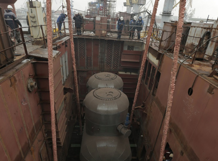 Окончанием формирования надстройки стала установка дымовой трубы. Она состоит из укрупненного блока секций весом 19 тонн. Кроме того, были погружены цистерны аварийного расхолаживания и деаэратор, вес которого составил 51 тонну. Далее специалисты погрузят камбузное оборудование и проведут отделку секций жилого блока. На данный момент на «Урале» проводятся швартовные испытания.